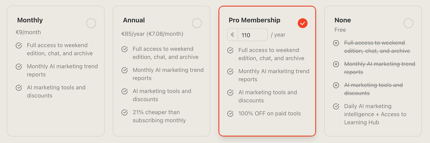 Upgrade to paid and on top of the free resources, you will have full access to our weekend deep-dives, monthly trend reports, chat & archive features, our collection of free AI marketing tools, plus 20% forever discount on our paid tools, such as the Repurposer.