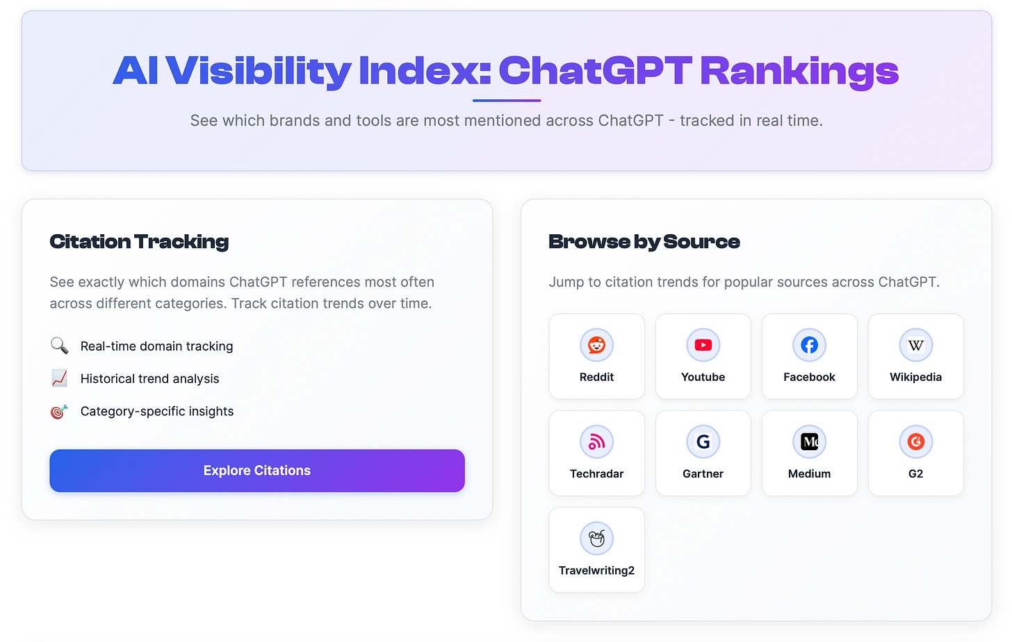 It also tells you who’s winning in your category and, critically, why. The citation source analysis is the piece we found most useful. It maps the domains ChatGPT is actually drawing from when forming opinions about your market — Reddit, G2, TechRadar, Medium, YouTube, and Wikipedia.