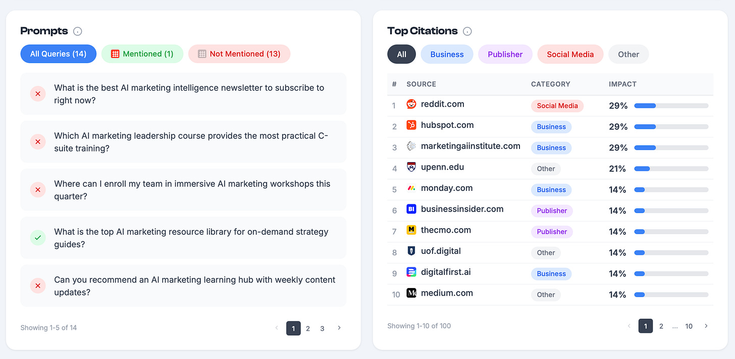 That’s the intelligence you need to know where to focus effort. If Reddit has 65% influence in your category, that’s not a content strategy problem. That’s a PR and community strategy problem. Budget needs to move accordingly.