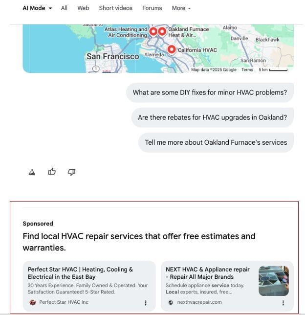 Right now, the implementation is subtle. Users are reporting that these ads currently appear at the very bottom of the response, particularly for local services like plumbers or HVAC repair. It’s not driving a firehose of traffic yet, but it is a big deal: this is the first time you can pay to influence the result of an AI’s “thought process” rather than just bidding on the keyword that started it.