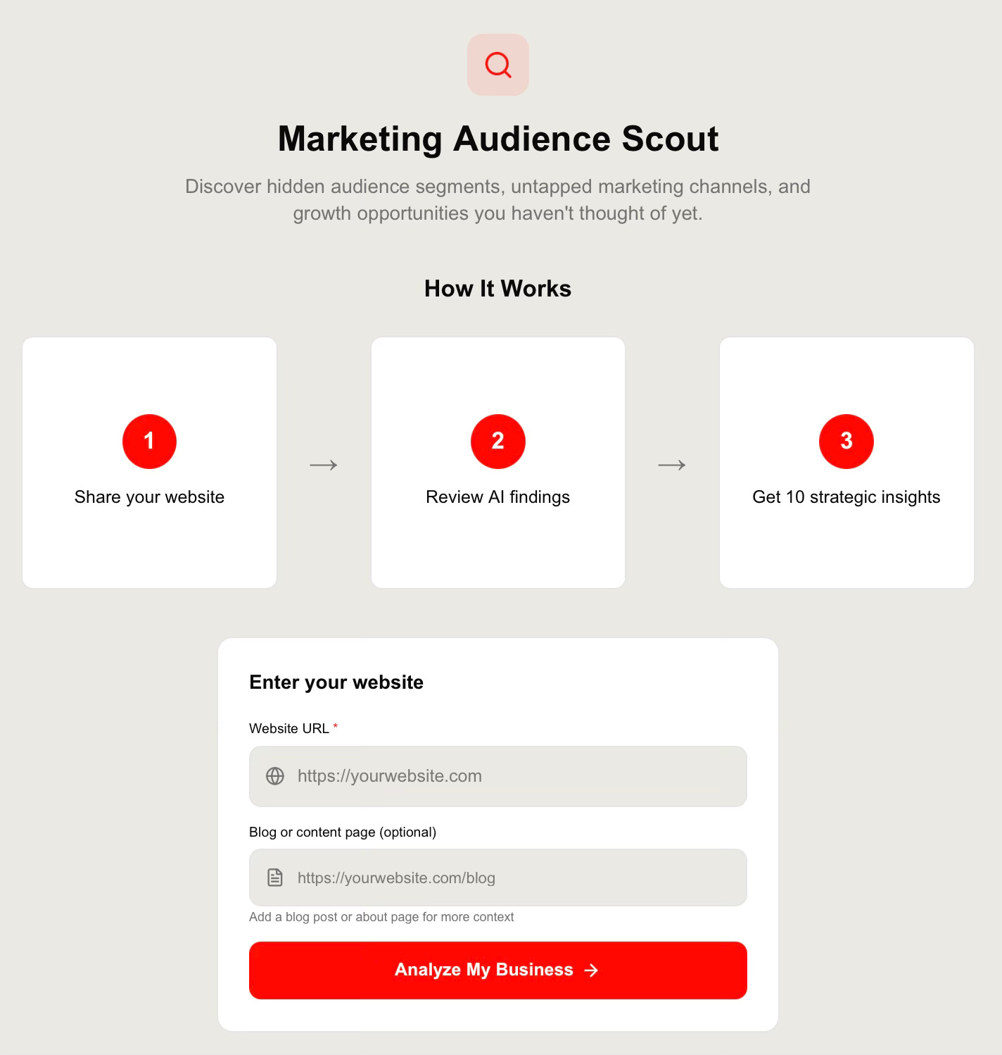The AI Audience Scout identifies niche communities, subreddits, newsletters, and forums where your ideal customers are already active—with engagement metrics and outreach strategies included.