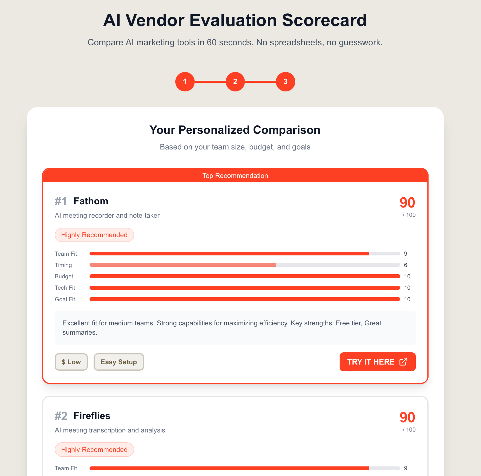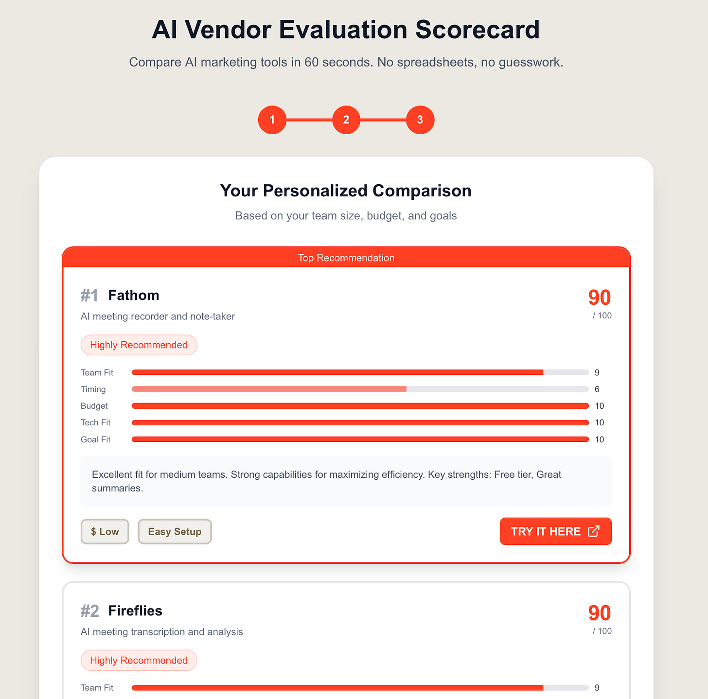 Compare AI marketing vendors side-by-side. Get objective scores based on features, pricing, integrations, and user reviews. Make vendor decisions your CFO will actually approve.