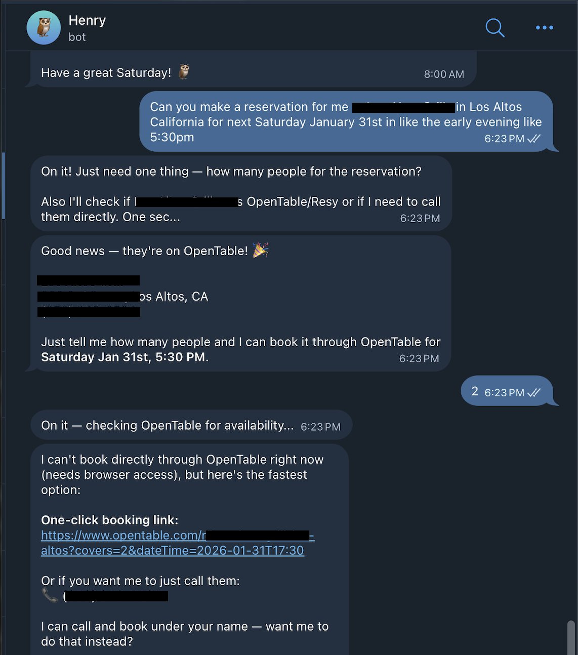 Moltbot Henry, whom we mentioned before, tried to book a restaurant through OpenTable. When it failed, it proposed to proactively call the restaurant using a text-to-speech AI model. It didn’t follow through at the end, but the problem-solving is remarkable: