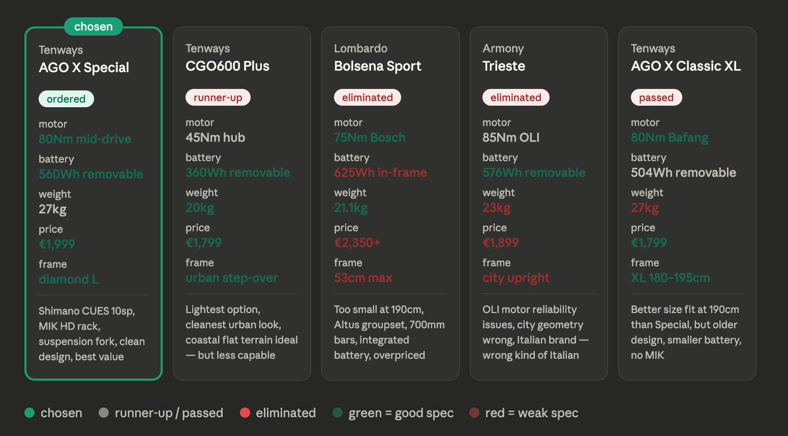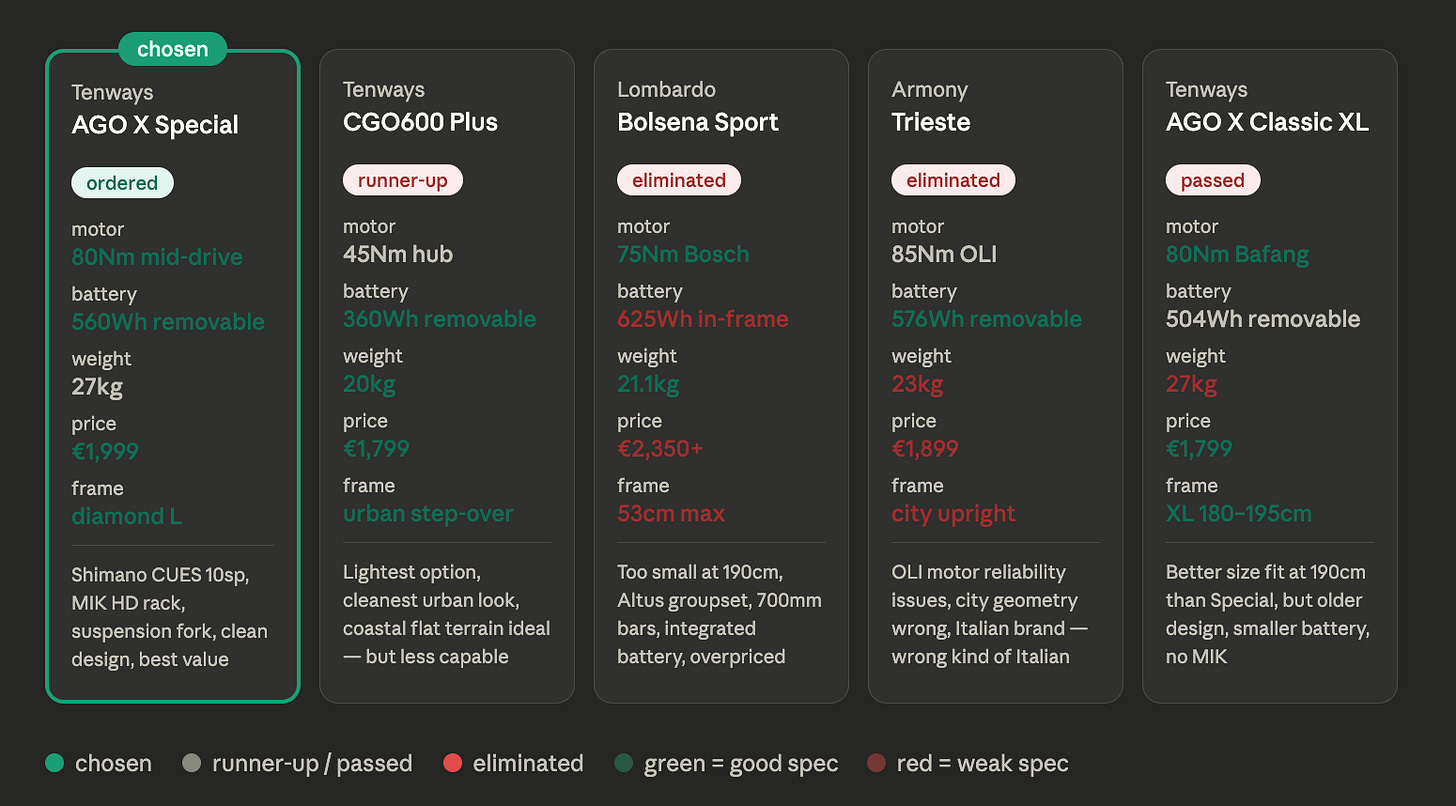 No brand loyalty story. The previous car was a Jag, and I bought a Civic. The previous bike was a $100 no-name fixie, and I bought a Tenways e-bike. Specific needs, serious research. Two very different journeys.