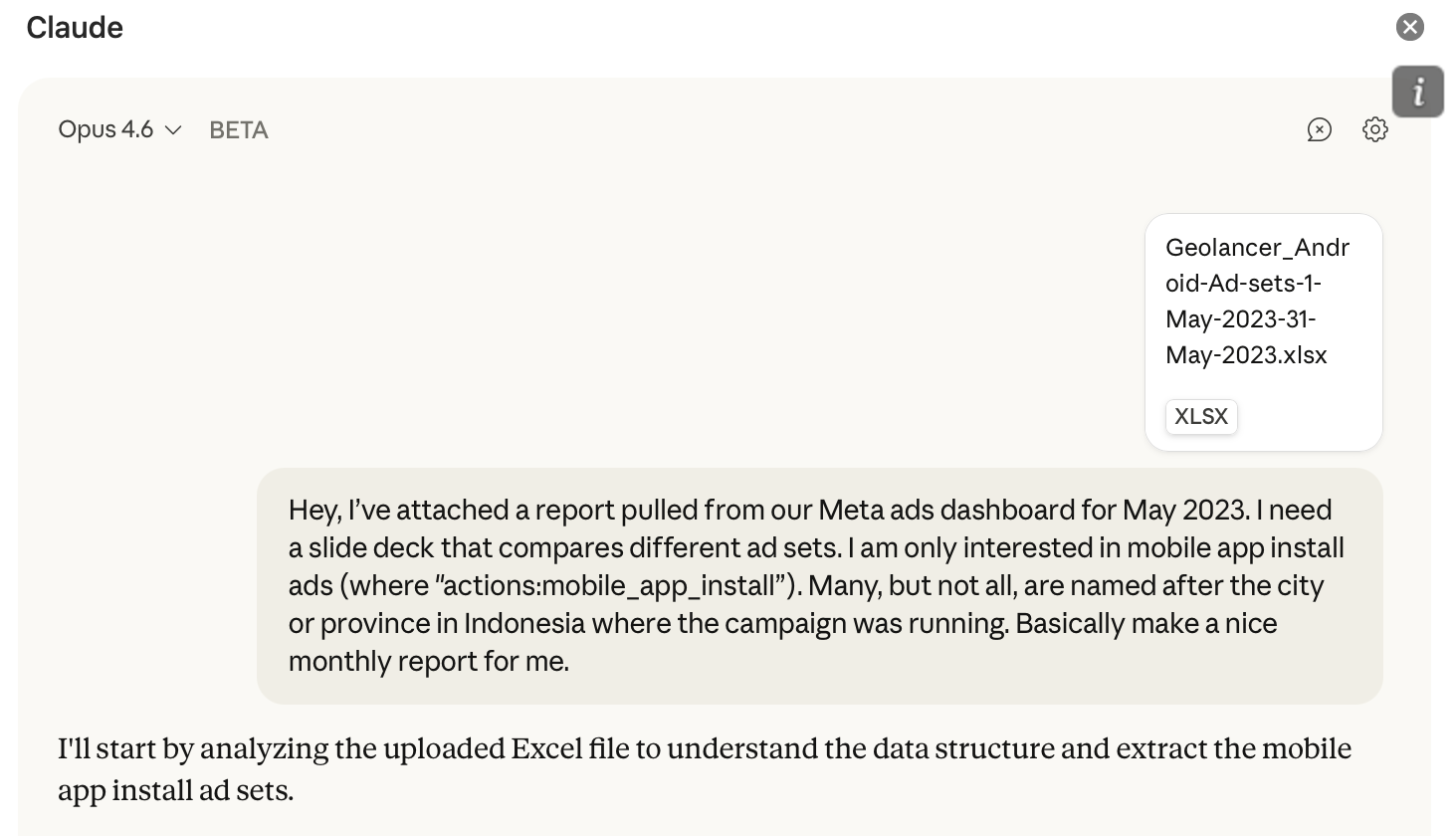 We used to spend some money on Meta to promote our mobile app, Geolancer. In my test, I asked Claude in PowerPoint to create a slide deck showing our monthly ad spending using the Meta ad dashboard export as input: