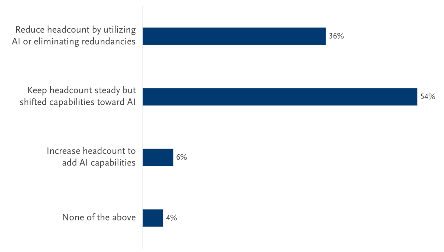These are also the companies creating new roles. Prompt engineers. AI ops analysts. AI search specialists. Data technologists. The survey found that only 4% of respondents hired new staff in the past year, so this isn’t exactly a hiring boom. But it signals that the smartest organizations aren’t just subtracting but restructuring around different capabilities.