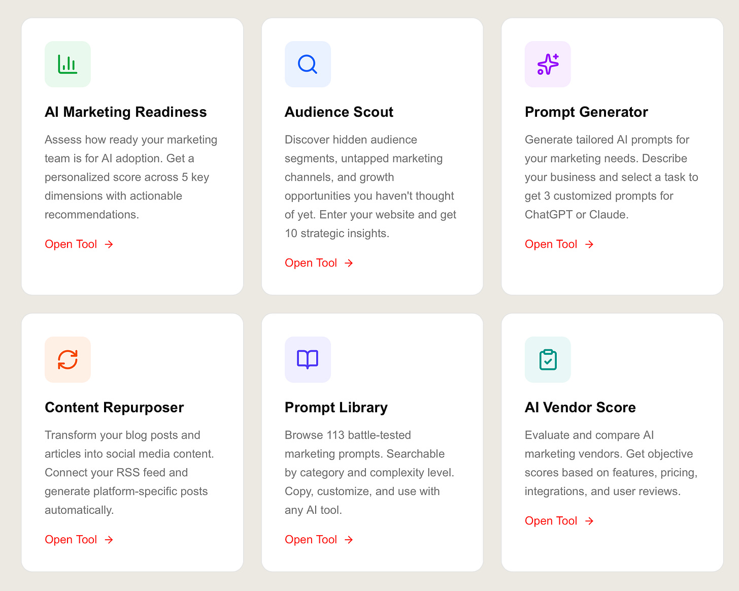 Each one solves a problem we had. We kept them minimal, easy-to-use, and actionable. For marketers, only.