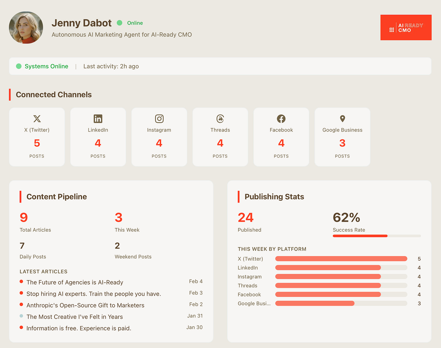 Built an autonomous AI agent (named it Jenny) who manages our entire marketing operation